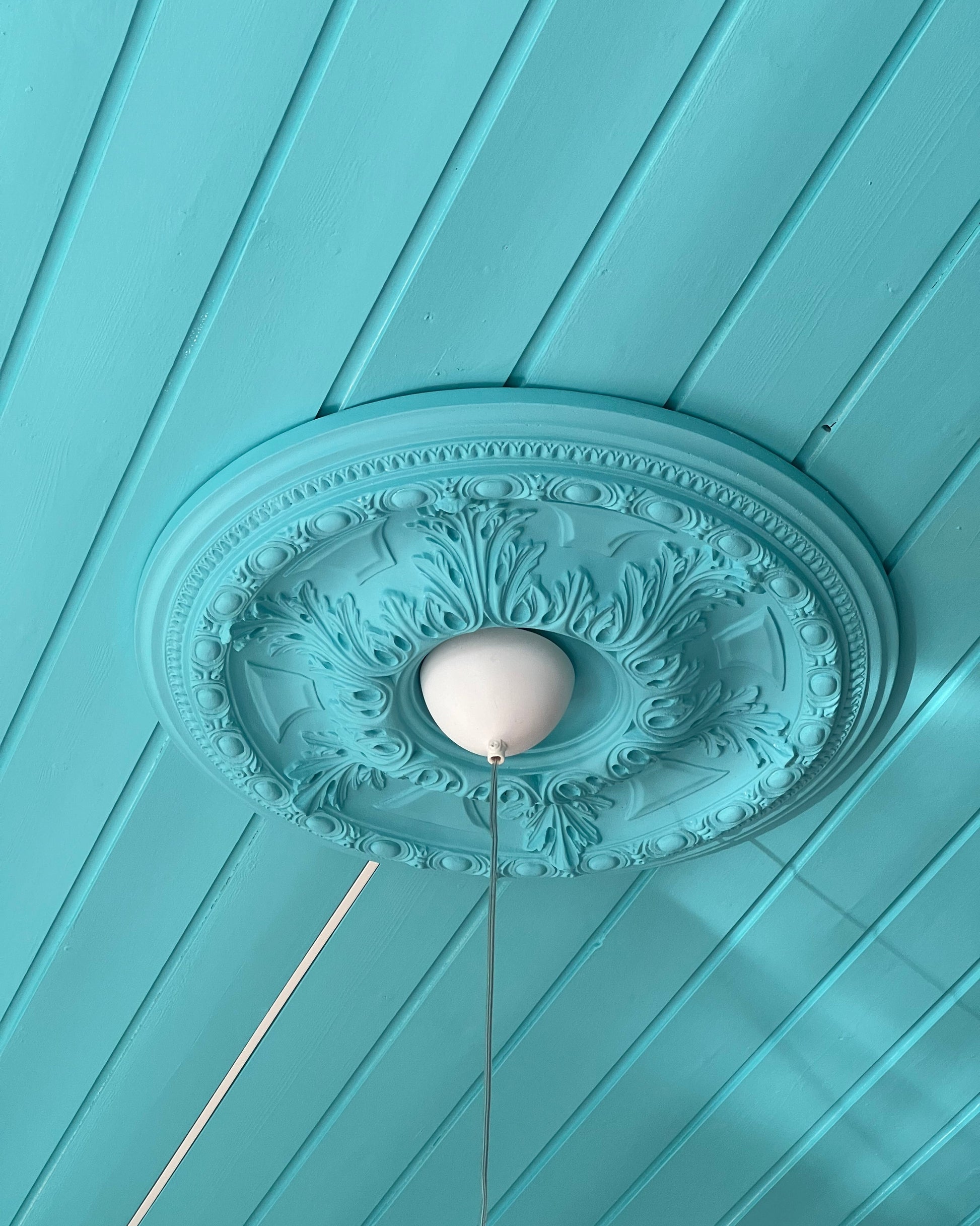 Le styromousse (polystyrène) est peint avec de la peinture à l'eau. Pour obtenir des informations sur l'installation, consultez le mode d'emploi dans la barre de menu, où vous pourrez également lire comment choisir la bonne rosace de plafond.