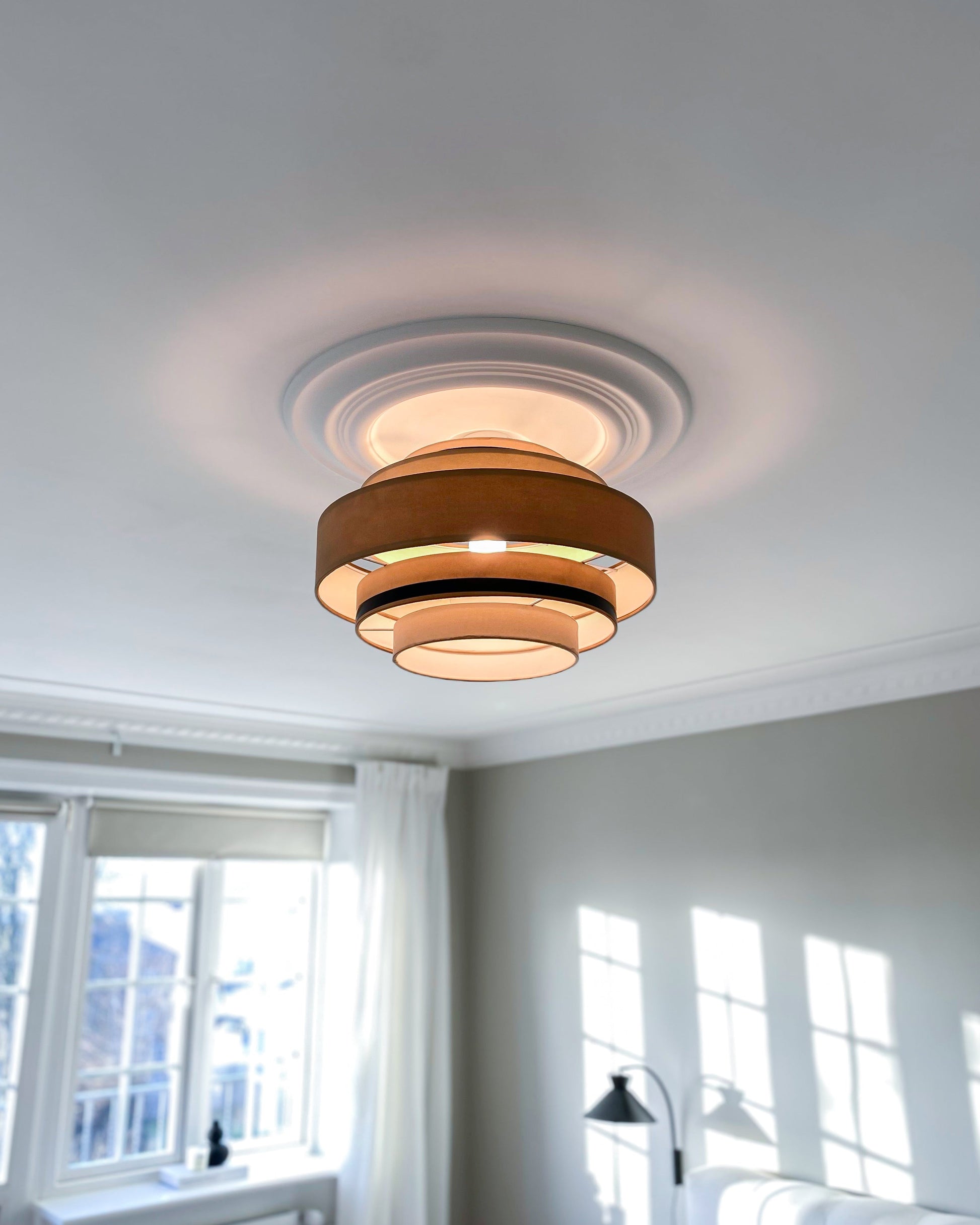 L’ensemble de plafond est utilisée au centre du plafond comme décoration. Si un support de lampe est installé, il y a un espace dans la rosace de plafond pour cacher les câbles électriques. Également utile pour les montages muraux tels que les appliques.
